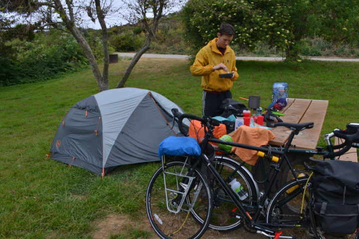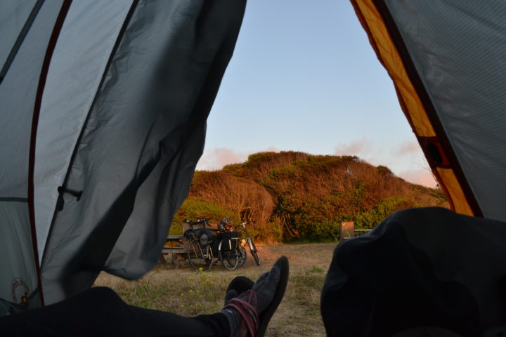 This little park is just south of Hearst Castle in a winding valley area of Highway 101. A nice reprieve from the ups and downs of the past few days and a makeshift little village of tents and bicycles from the people we’d been pseudo-riding with since Monterey.
